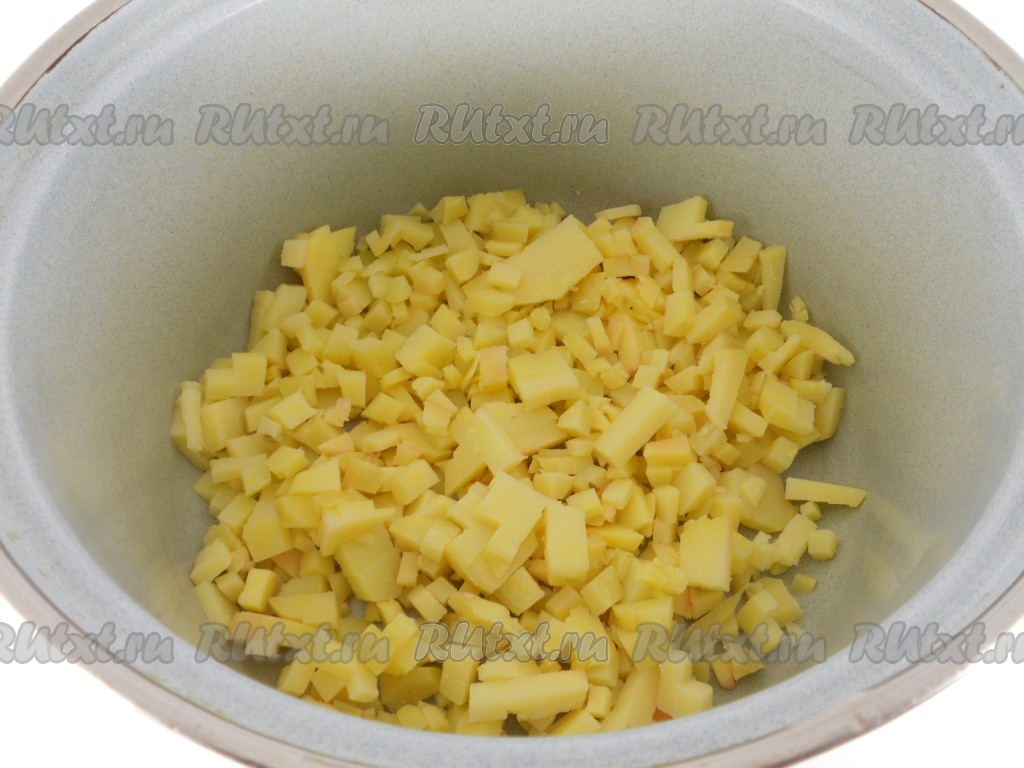 На небольшие кубики нарезать очищенный варёный картофель, выложить к свекле с морковкой.