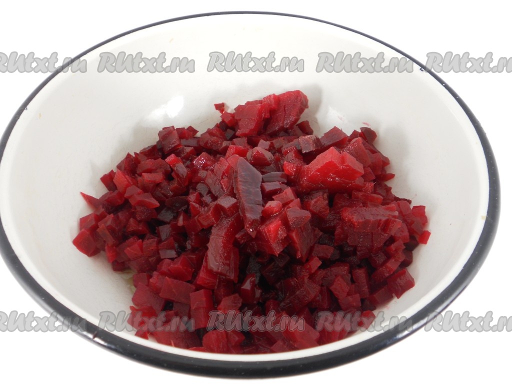 Свеклу вымыть, полностью залить водой, поставить на огонь и отварить до готовности (в зависимости от сорта и размера свеклы на это потребуется от 45 до 60 минут с момента закипания воды). Картошины и морковь вымыть и тоже отварить в кожуре до готовности (в течение 25-30 минут с момента закипания воды, готовые корнеплоды будут легко прокалываться ножом). Варёные свеклу, морковь и картошку полностью остудить. Свеклу очистить, нарезать на небольшие кубики, выложить в миску, влить 1 столовую ложку растительного масла, перемешать (благодаря маслу, свекла сильно не окрасит все овощи).