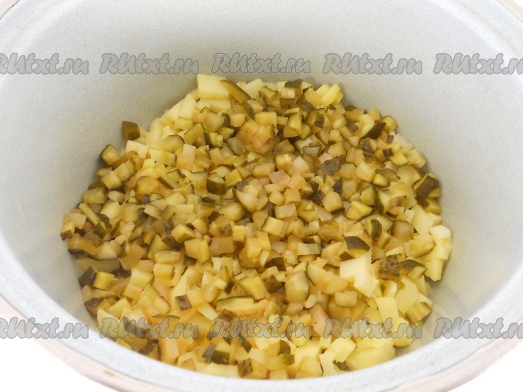 Сюда же выложить огурцы, нарезанные на небольшие кубики.