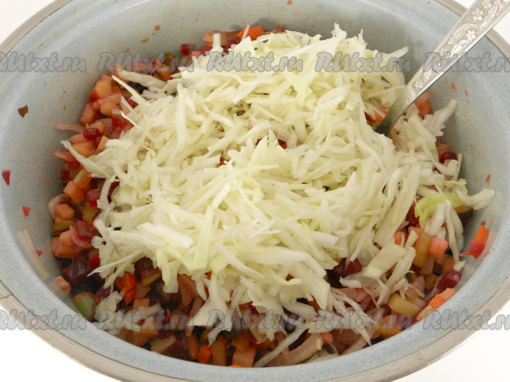 Свежую капусту тонко нарезать, чуть посолить и помять руками. Добавить капусту к остальным ингредиентам. Посолить, всыпать сахар, влить оставшееся растительное масло и уксус. Хорошо перемешать винегрет.