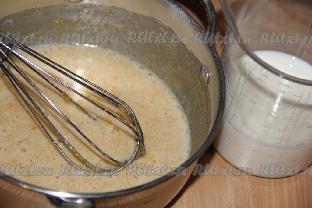Затем вливаем молоко, добавляем ванильный сахар и хорошо перемешиваем венчиком. Ставим кастрюлю с кремом на средний огонь и, постоянно помешивая, доводим до кипения.