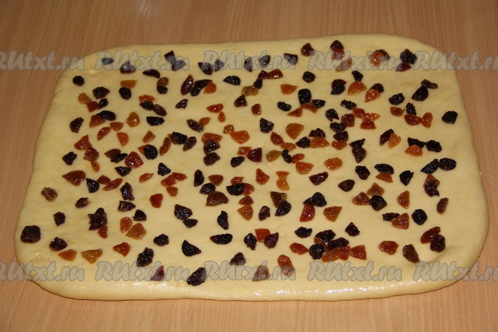 Поднявшееся тесто хорошо обминаем. На присыпанной мукой поверхности раскатываем тесто в прямоугольный пласт, смазываем растительным маслом и выкладываем изюм.