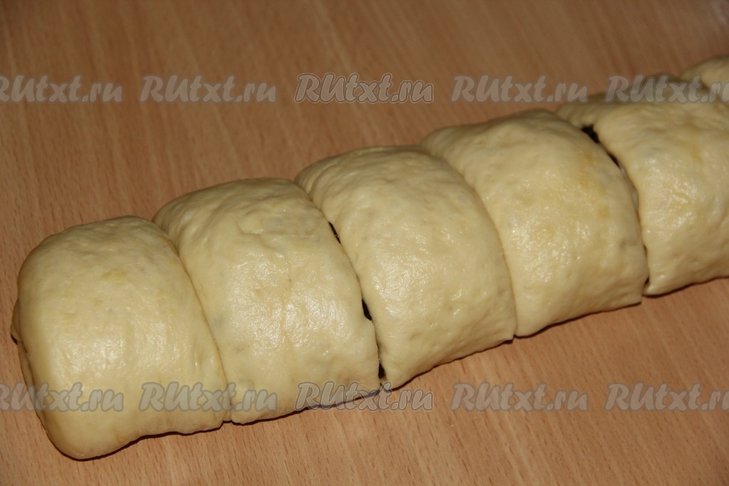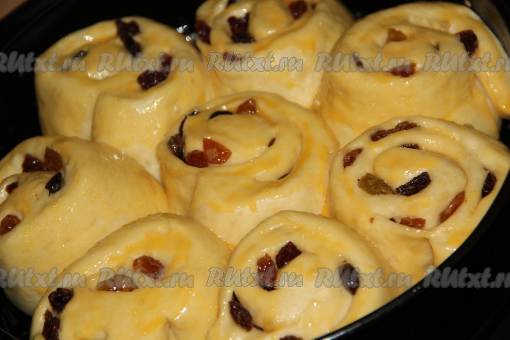 Выкладываем булочки в форму для выпечки, смазанную растительным маслом, оставляя место между ними. Накрываем форму с булочками полотенцем и оставляем в тепле на 30-40 минут.