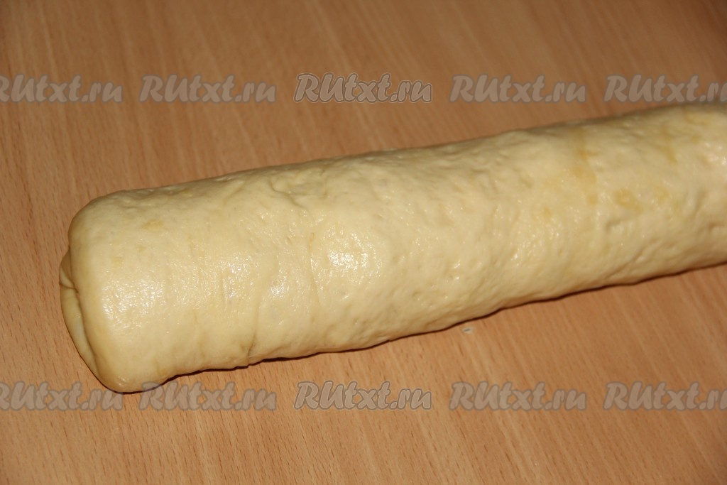 Сворачиваем тесто в плотный рулет, начиная с широкой стороны.