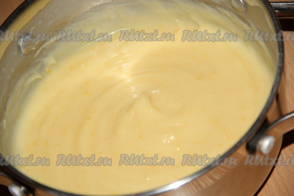 Варим заварной крем, не прекращая перемешивать, 4-5 минут (до загустения). Затем снимаем кастрюлю с огня, закрываем крышкой и отставляем в сторону.