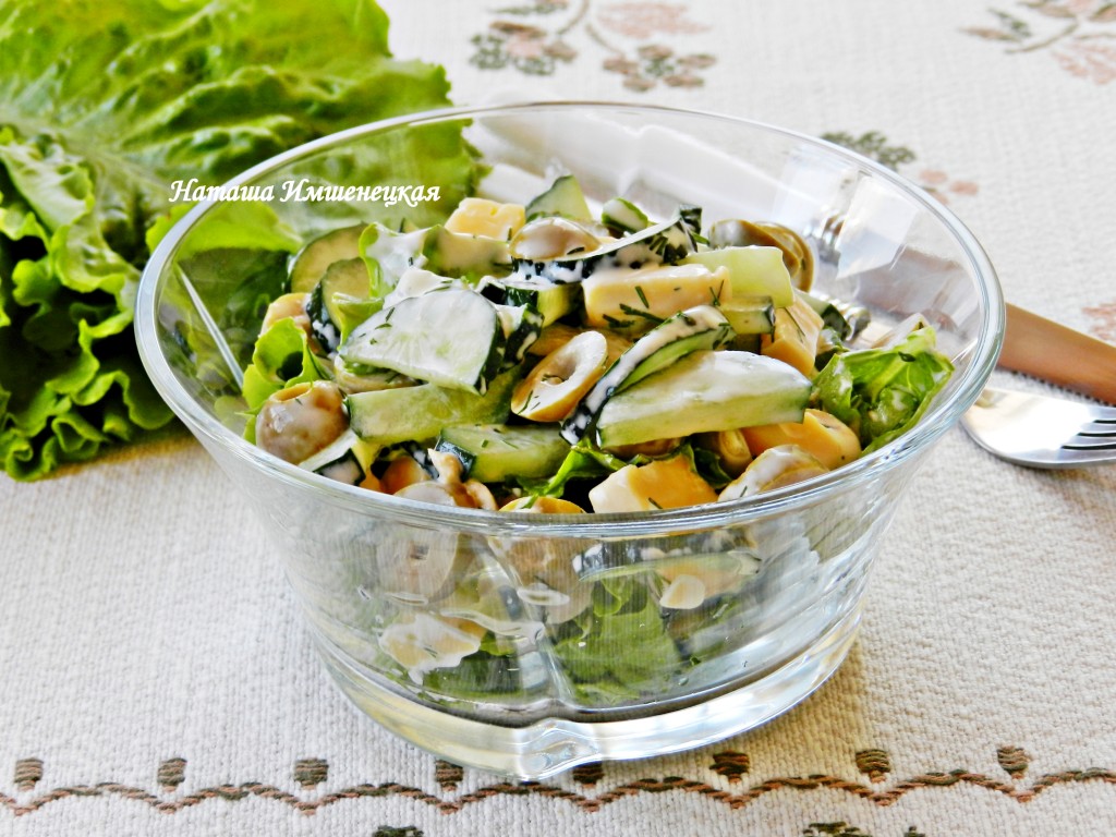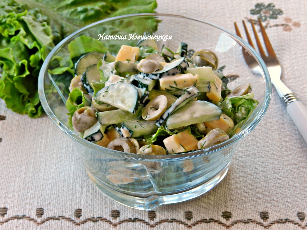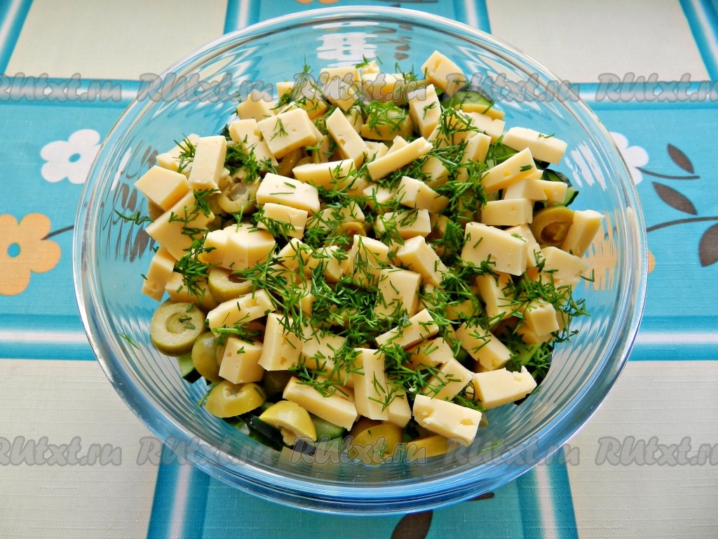 Простой и вкусный салат из огурцов, оливок и сыра готов.