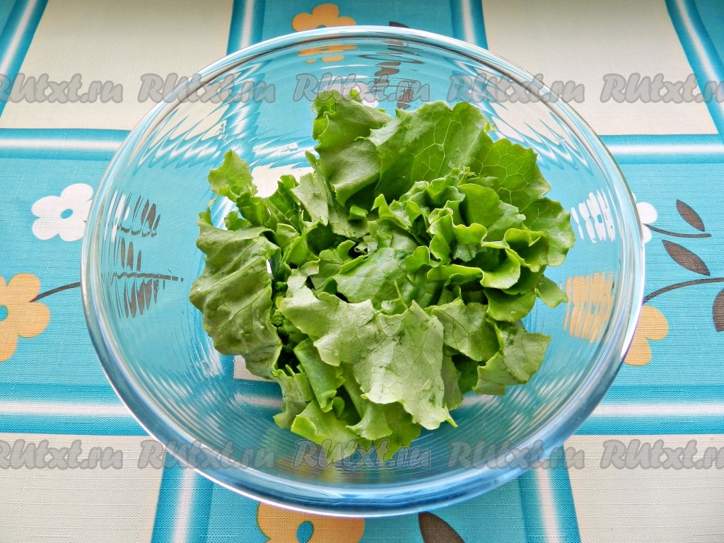 Листья салата вымыть, обсушить и нарвать руками.