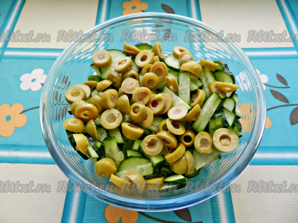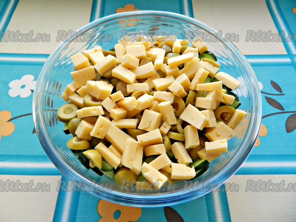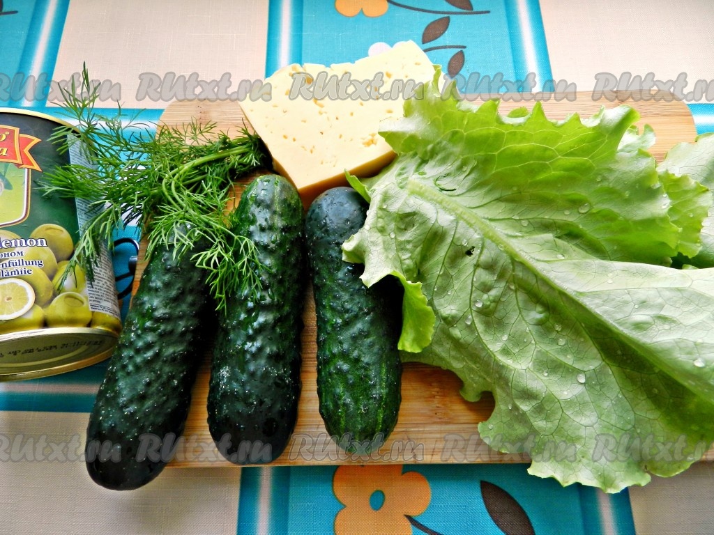 Для приготовления салата из огурцов, оливок и сыра понадобится:
