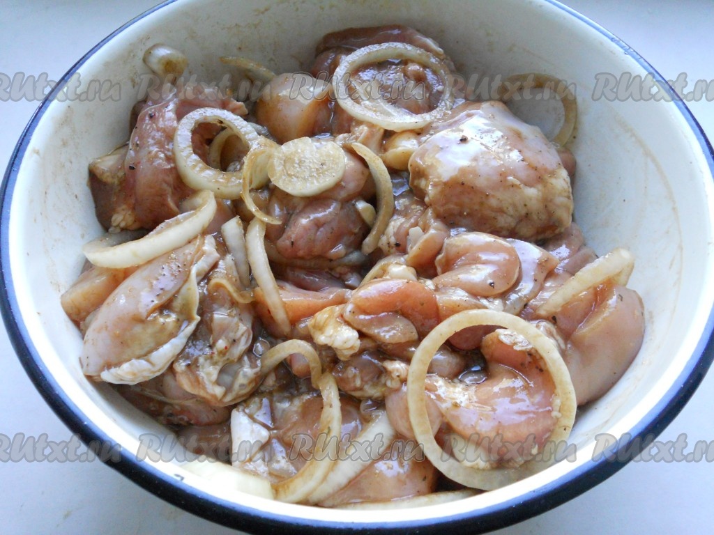Репчатый лук очистить и нарезать кольцами, добавить к куриному мясу. Я настоятельно советую добавить лук, так как во время маринования он отлично размягчает мясо и ваш шашлык будет очень нежным.