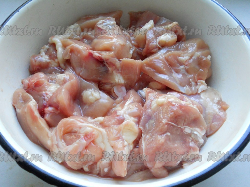 Куриное мясо освободить от костей. Нарезать на кубики размером примерно 4 сантиметра на 4 сантиметра. Лучше всего для шашлыка подходит филе бедра, так как в нём присутствует жир. Также можно взять филе грудки, тогда ваш куриный шашлык получится менее сочным, но более диетическим.
