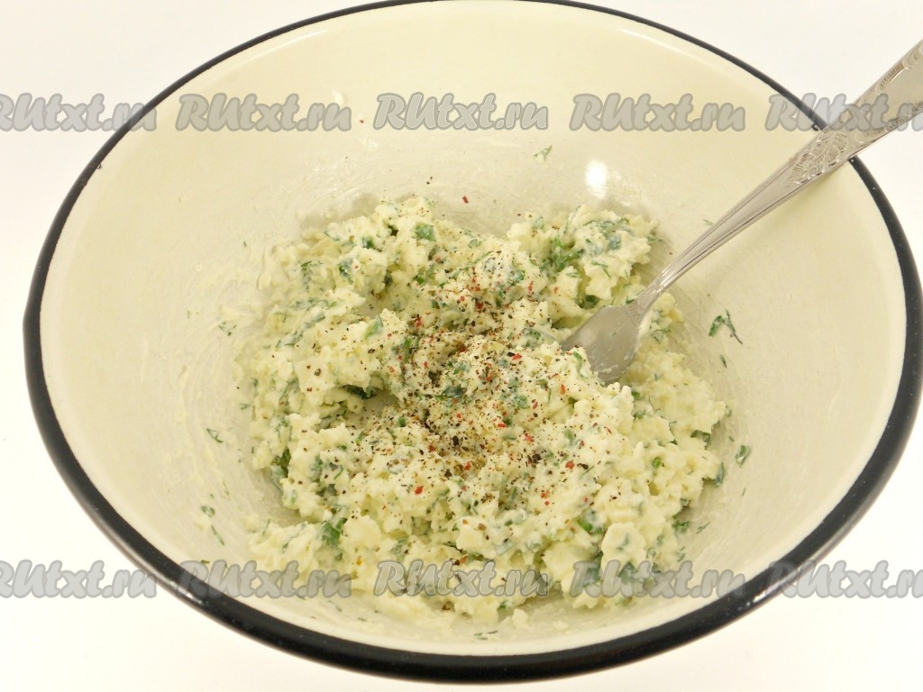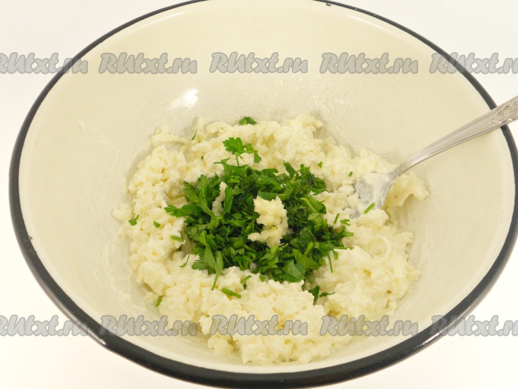 Добавить к брынзе измельченную зелень и чеснок, пропущенный через пресс.