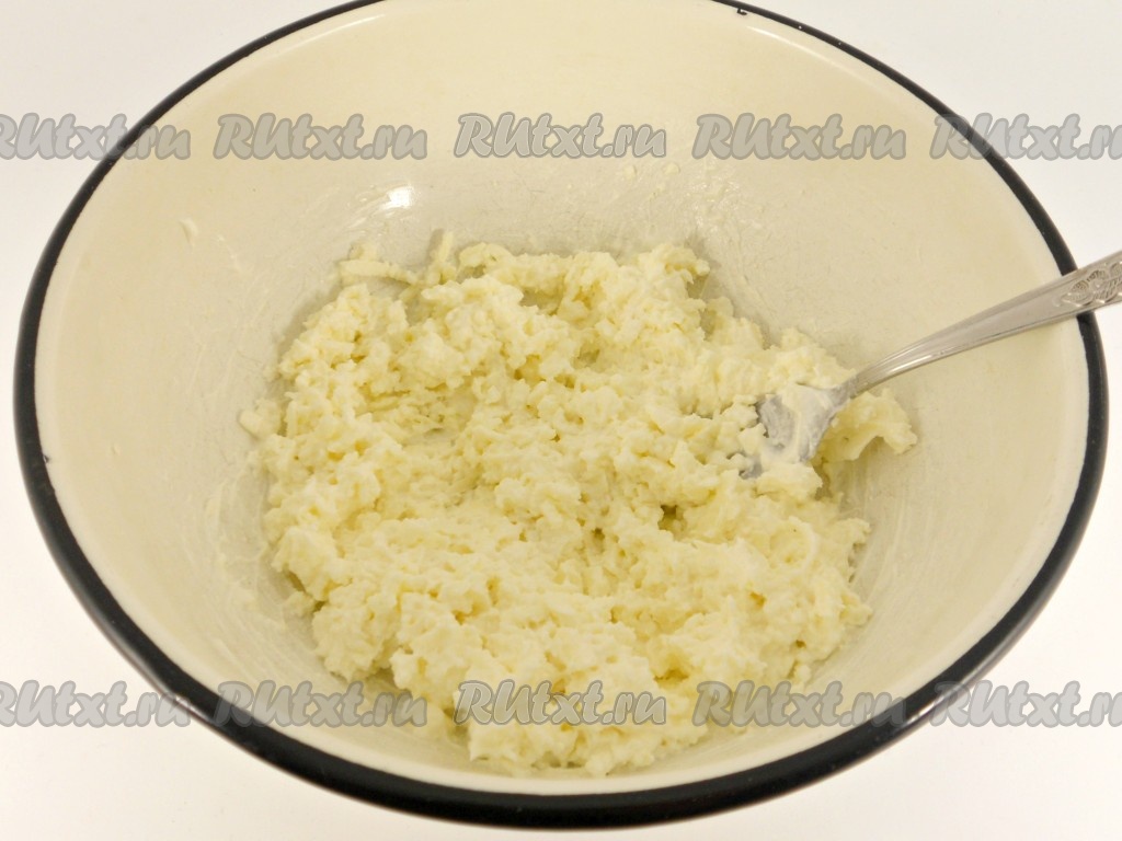 Брынзу натереть на терке или размять вилкой.