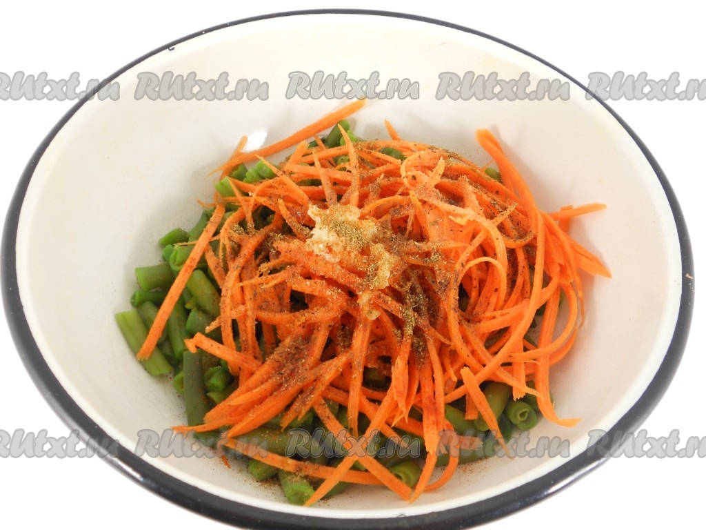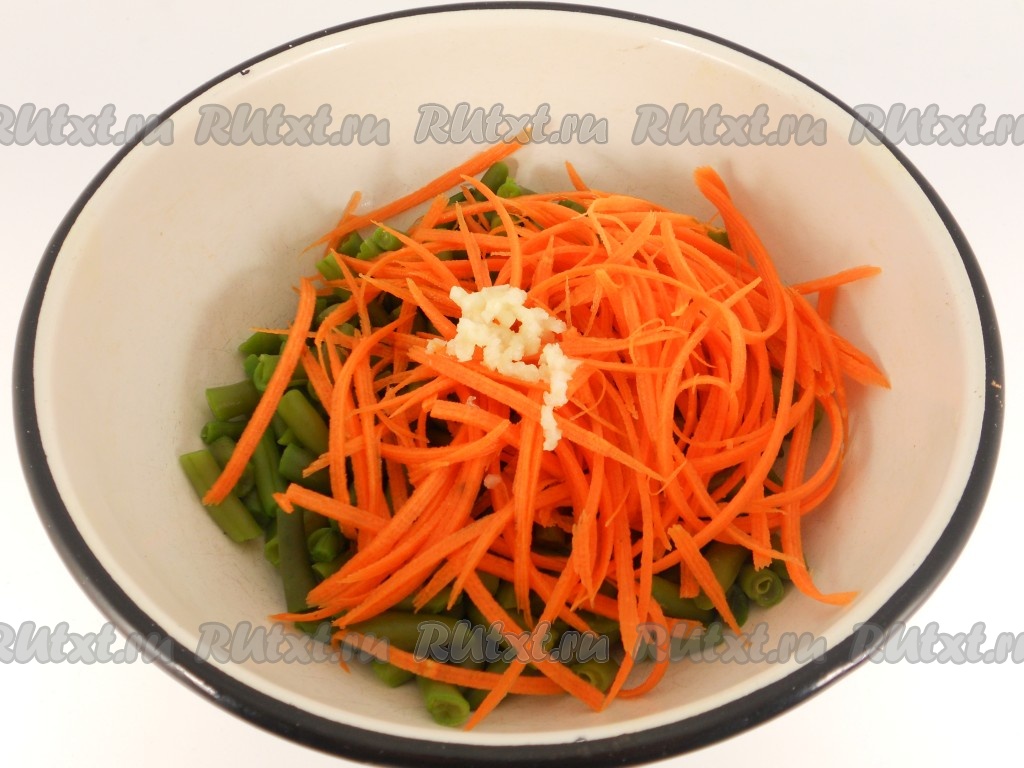 Добавить морковь, натертую на терке для корейской моркови, и чеснок, пропущенный через пресс.