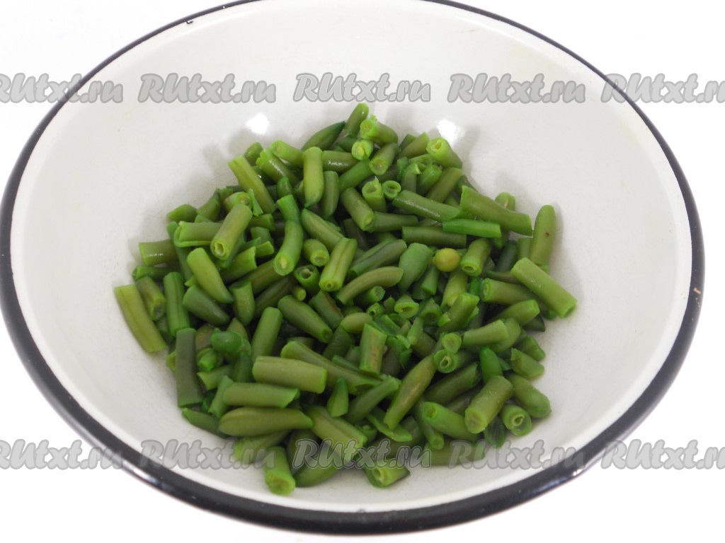 Зеленую фасоль залить водой и поставить на огонь. Варить 6-8 минут после закипания, после чего откинуть на дуршлаг и промыть холодной водой. Дать воде стечь и поместить фасоль в глубокую миску.