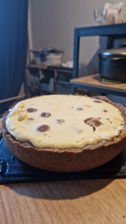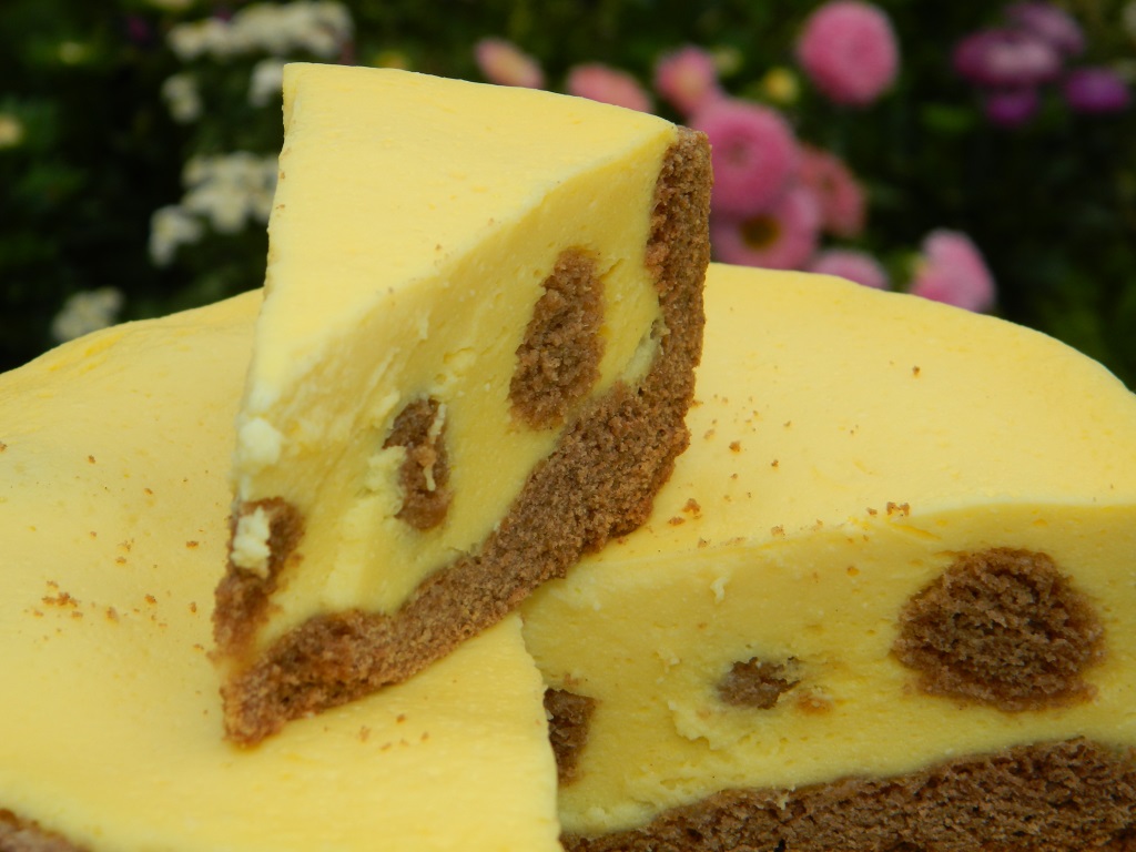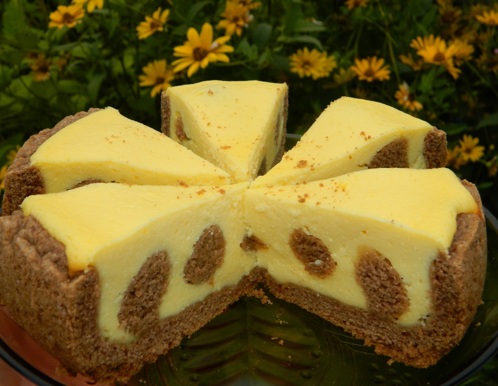 Посмотрите, какой восхитительный разрез у нашего творожного пирога, начинка хорошо застыла и пирог режется замечательно.