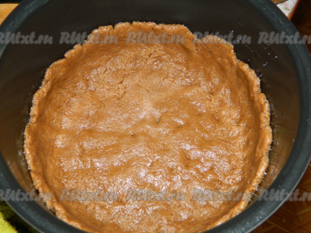 Чашу мультиварки смазываем растительным маслом. Немного теста откладываем для украшения, а остальное тесто распределяем по дну чаши мультиварки, формируя высокие бортики.