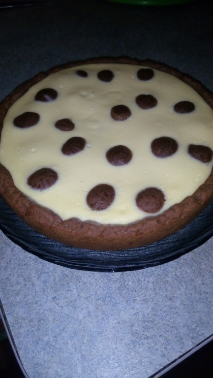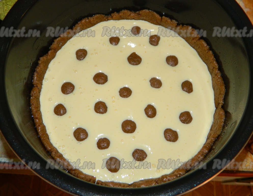 На тесто выливаем начинку. Ранее отложенное тесто скатываем в маленькие шарики и раскладываем их по творожному пирогу. Выставляем в мультиварке режим "Выпечка" и готовим 1 час 25 минут.
