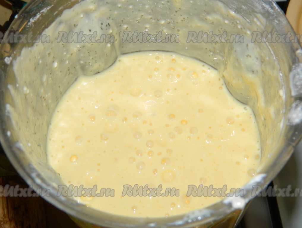 Для приготовления творожной начинки смешиваем все ингредиенты начинки (творог, сметану, яйца, крахмал и сахар). Я для этого воспользовалась блендером с чашей, можно также смешать погружным блендером или в измельчителе. Творожная начинка будет жидковатой, пусть вас это не пугает, так как в ней есть крахмал, а он поможет хорошо схватиться начинке.