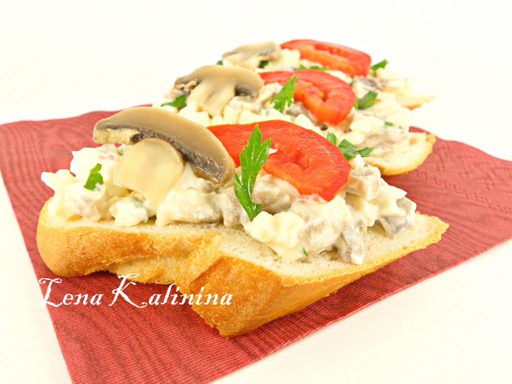 Багет нарезать, выложить на ломтики получившуюся грибную массу. Украсить вкуснейшие бутерброды дольками помидоров, грибочками и зеленью. Вкусные, аппетитные, сытные бутерброды, приготовленные с маринованными грибами, станут отличной закуской и к повседневному, и к праздничному столу!