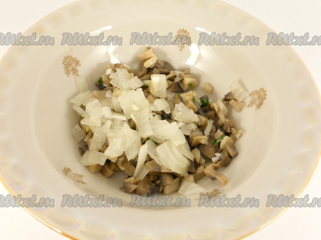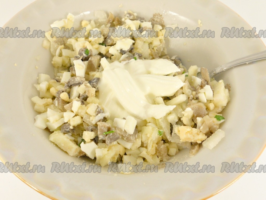 Затем к грибам и луку добавить яйцо, нарезанное на мелкие кубики, перемешать. Посолить по вкусу и заправить и майонезом.