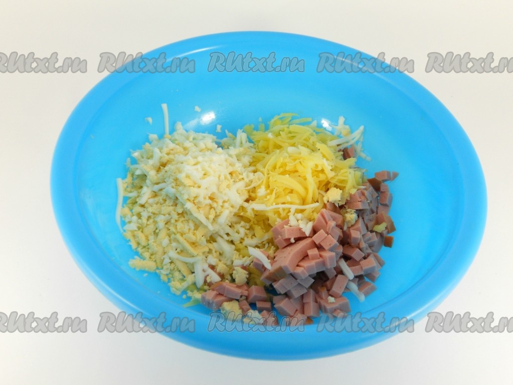 Отварные яйца и сыр натереть на крупной терке. Добавить нарезанную мелким кубиком или соломкой колбасу.