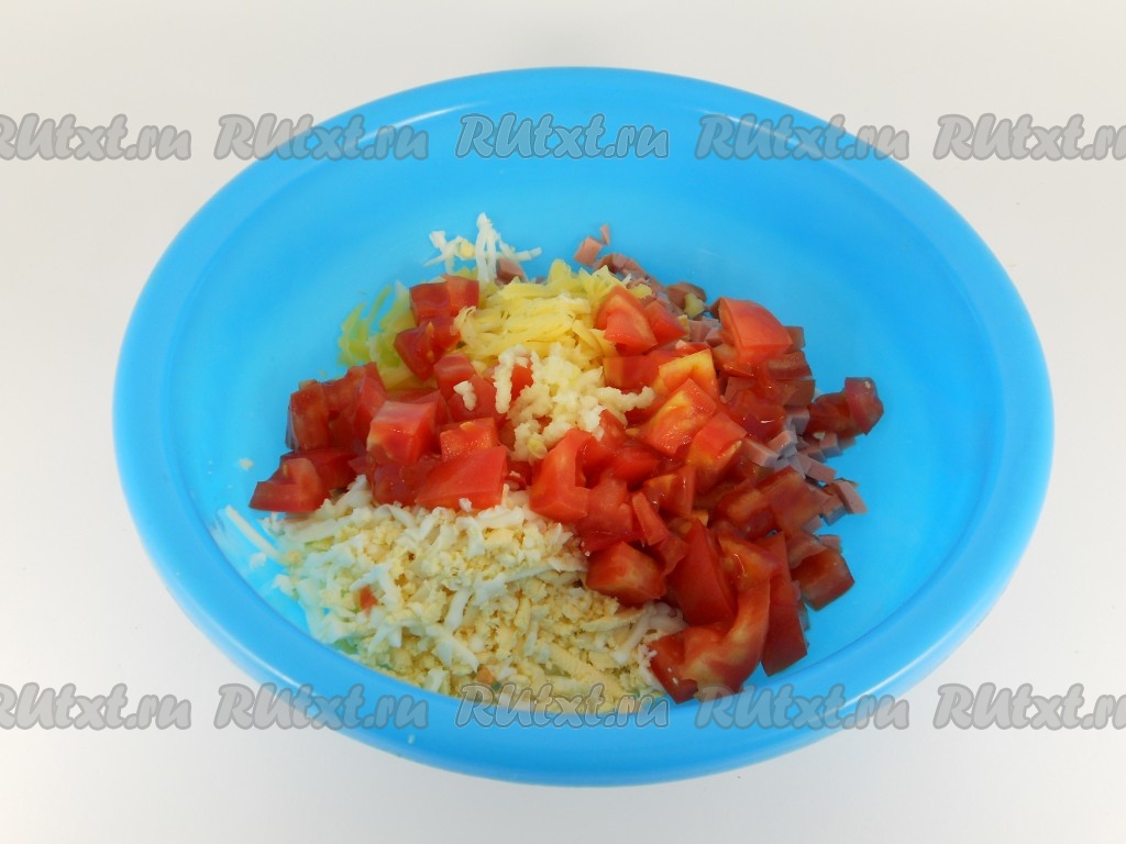 Затем добавить порезанный кубиком свежий помидор.