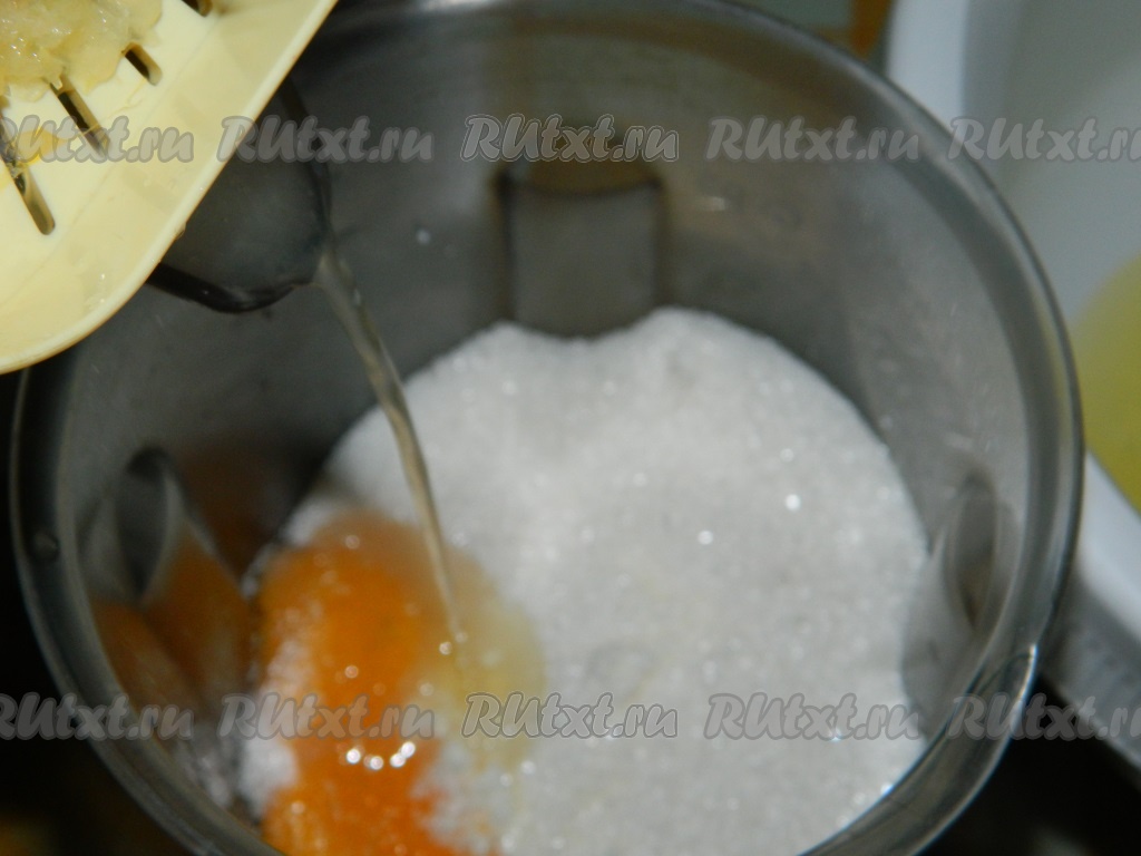 Яйца разделяем на белки и желтки. Оставшийся лимонный сок, творог, яичные желтки и сахар взбиваем блендером до однородной массы.