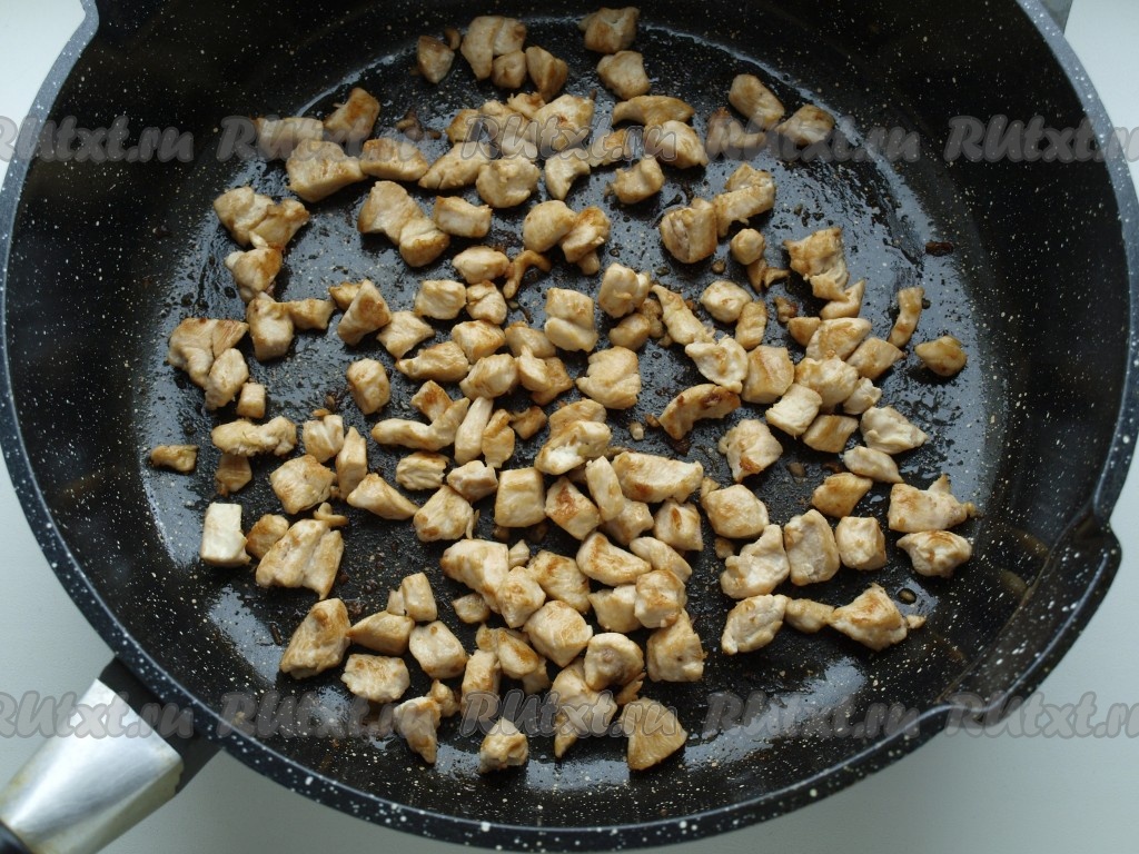 Куриное филе, порезанное небольшими кубиками, обжариваем на растительном масле со всех сторон до румяной корочки.