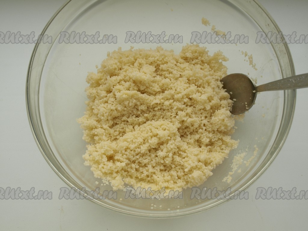 Заливаем кус-кус кипятком в соотношении 1:1, тщательно перемешиваем, чтобы вся жидкость впиталась.