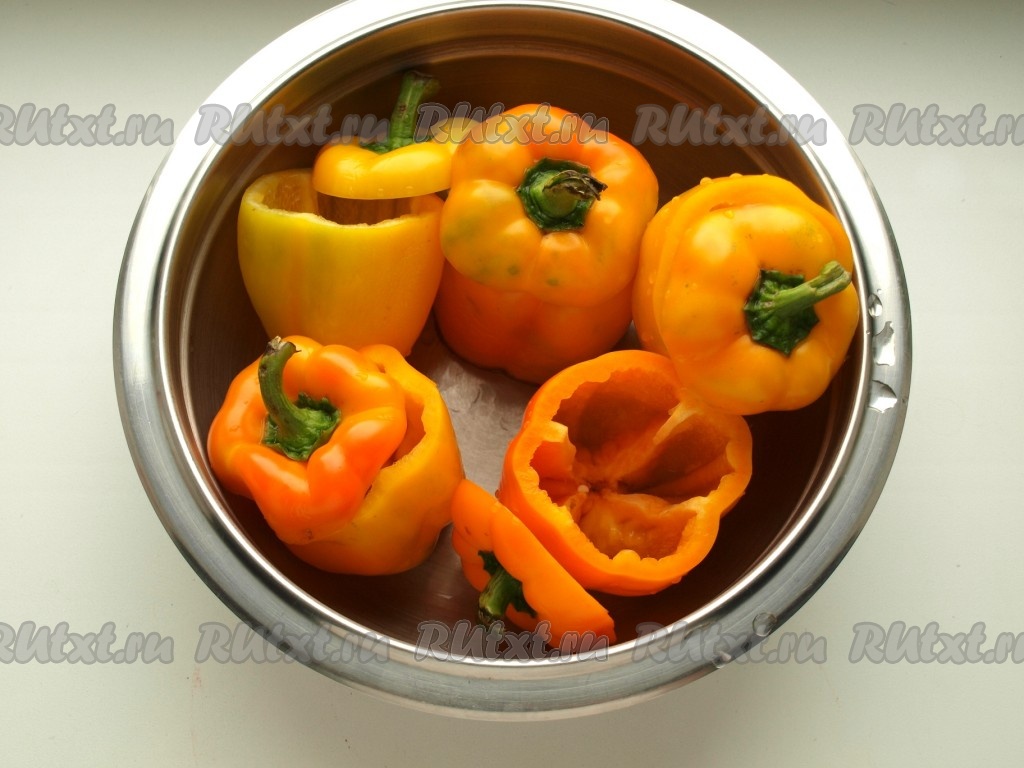 Срезаем с перцев крышечку, удаляем из перцев семена. Перцы помещаем минут на 5 в кипяток, затем обдаём холодной водой и обсушиваем бумажными полотенцами. Снаружи подготовленные перцы смазываем растительным маслом.