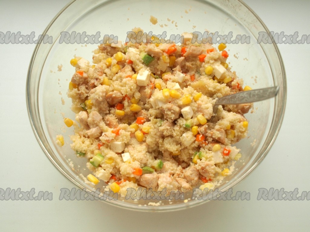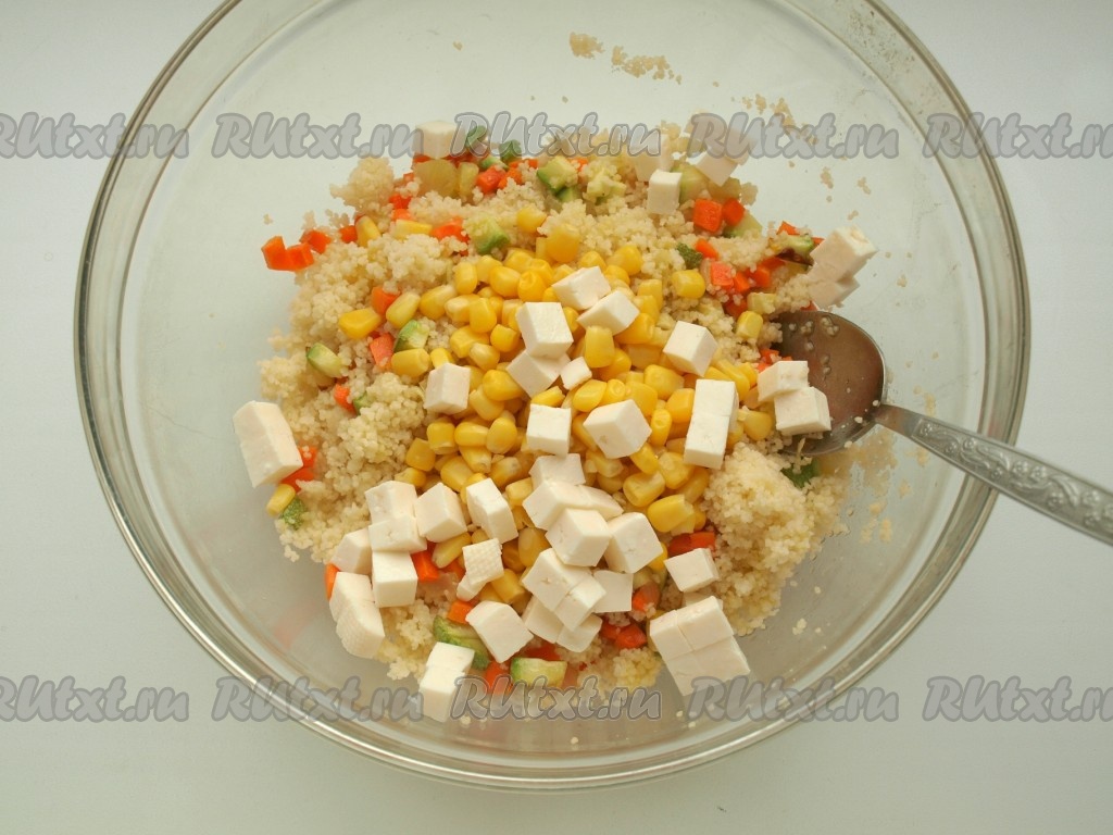 Добавляем к кус-кусу обжаренные овощи, брынзу, нарезанную кубиками, и кукурузу.