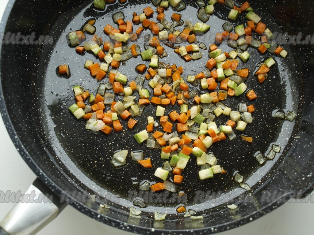 Лук, кабачок и морковь чистим и режем кубиками, обжариваем на растительном масле до золотистого цвета.