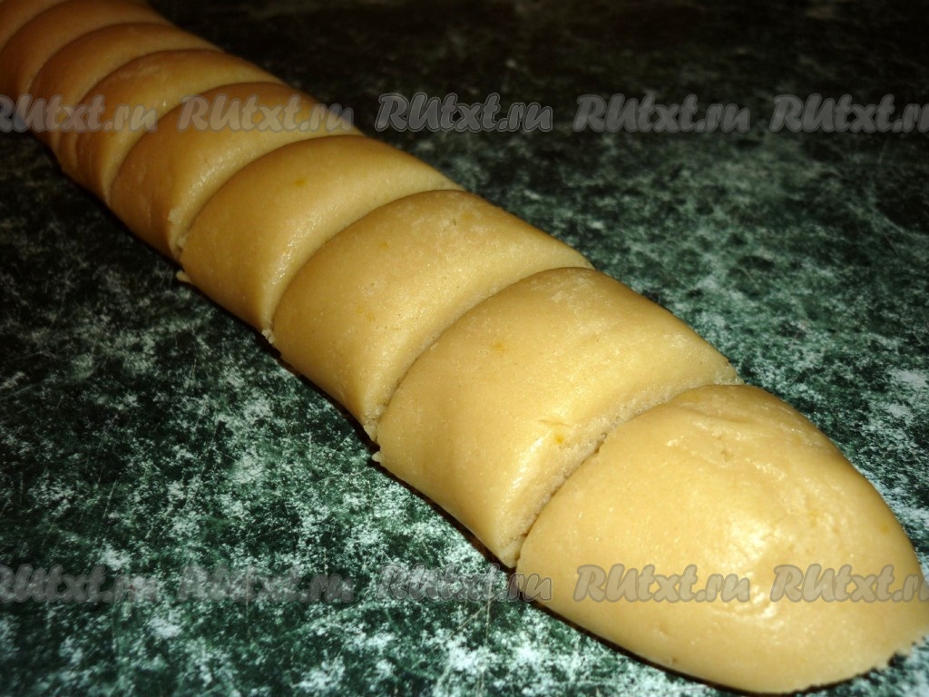 Охлажденное тесто скатываем в колбаску и разрезаем на небольшие кусочки.