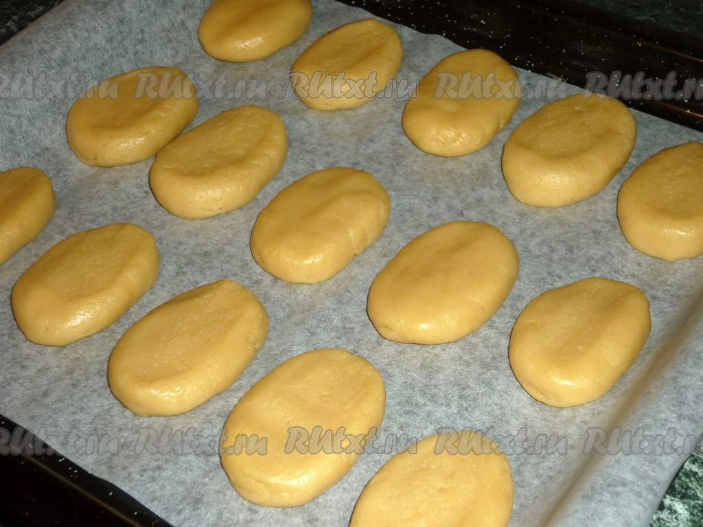 Каждому кусочку теста придаём овальную форму и выкладываем на противень, застеленный пекарской бумагой.