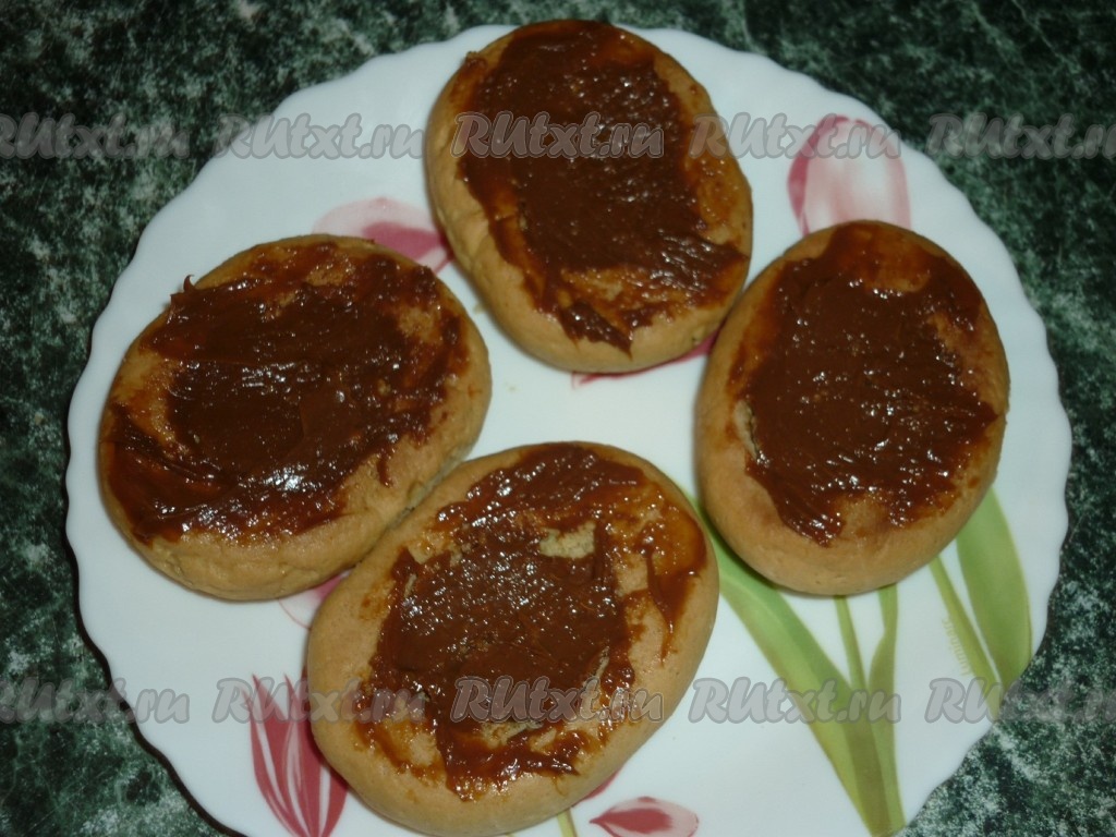 В получившуюся выемку кладём немного вареной сгущенки, края печенья тоже слегка смазываем.