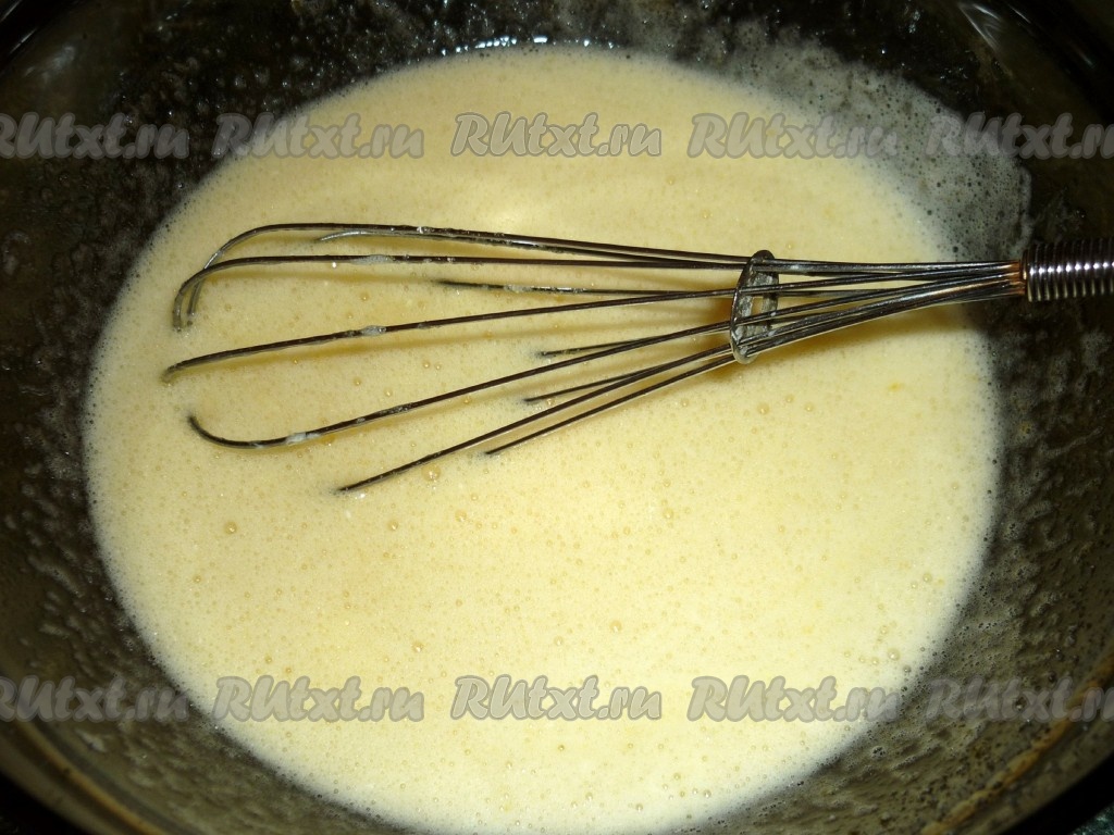 Яйца, желтки и сахар соединяем в миске и тщательно перемешиваем.