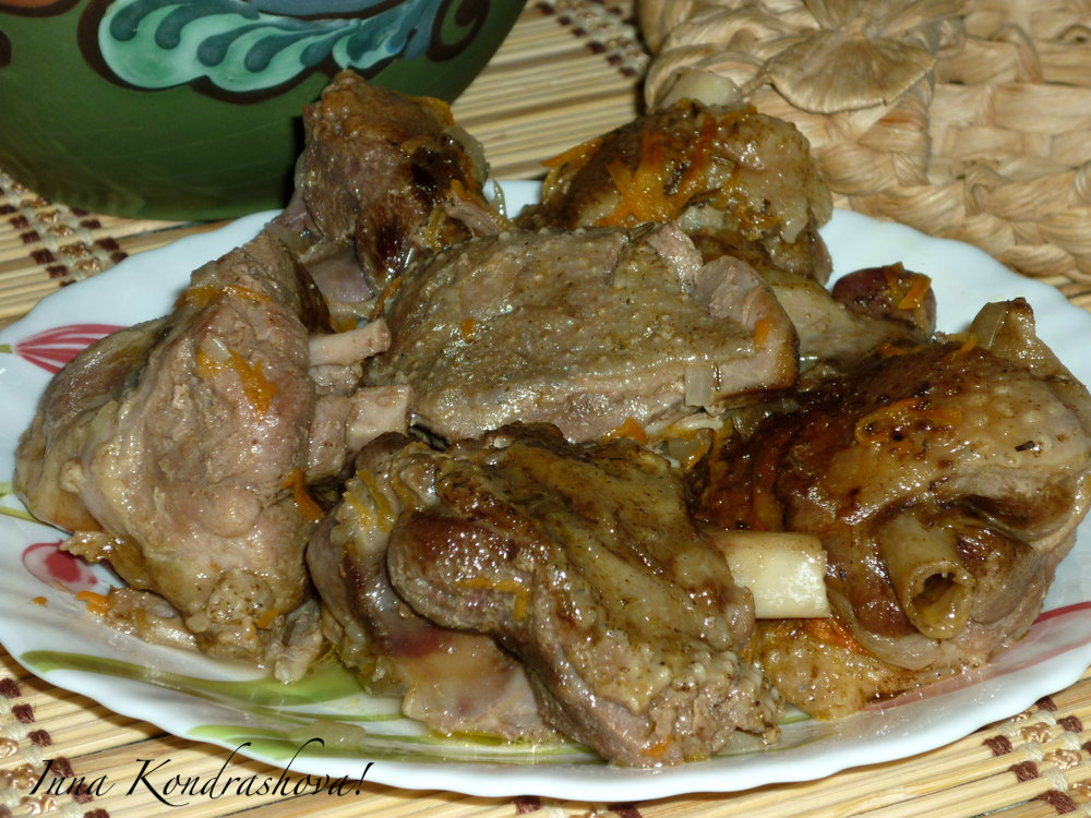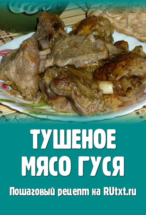 Очень вкусного тушеного гуся подаём с любым гарниром, полив его подливой.