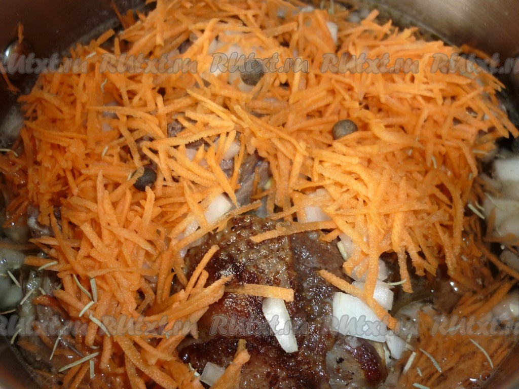 Добавляем к кусочкам гуся порезанный лук, натёртую на тёрке морковь, перец, приправы, лавровый лист, доводим до кипения, уменьшаем огонь и тушим на маленьком огне под крышкой 1-1,5 часа.