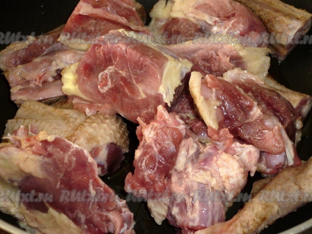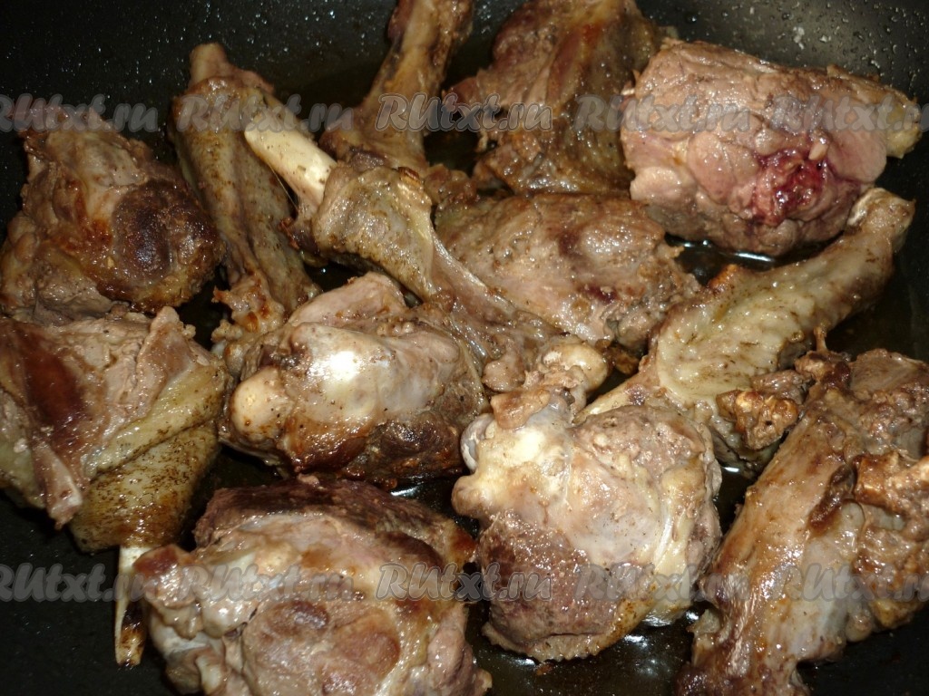 Порезанное мясо обжариваем на сковороде на разогретом растительном масле до румяной корочки. Солим по вкусу.