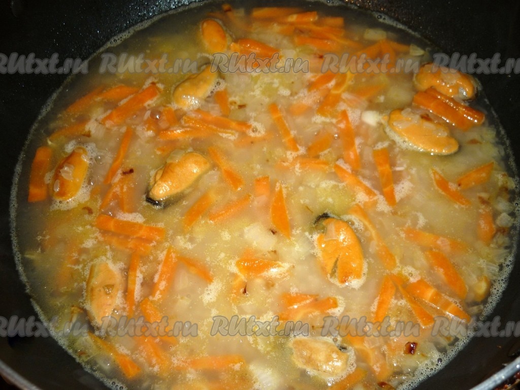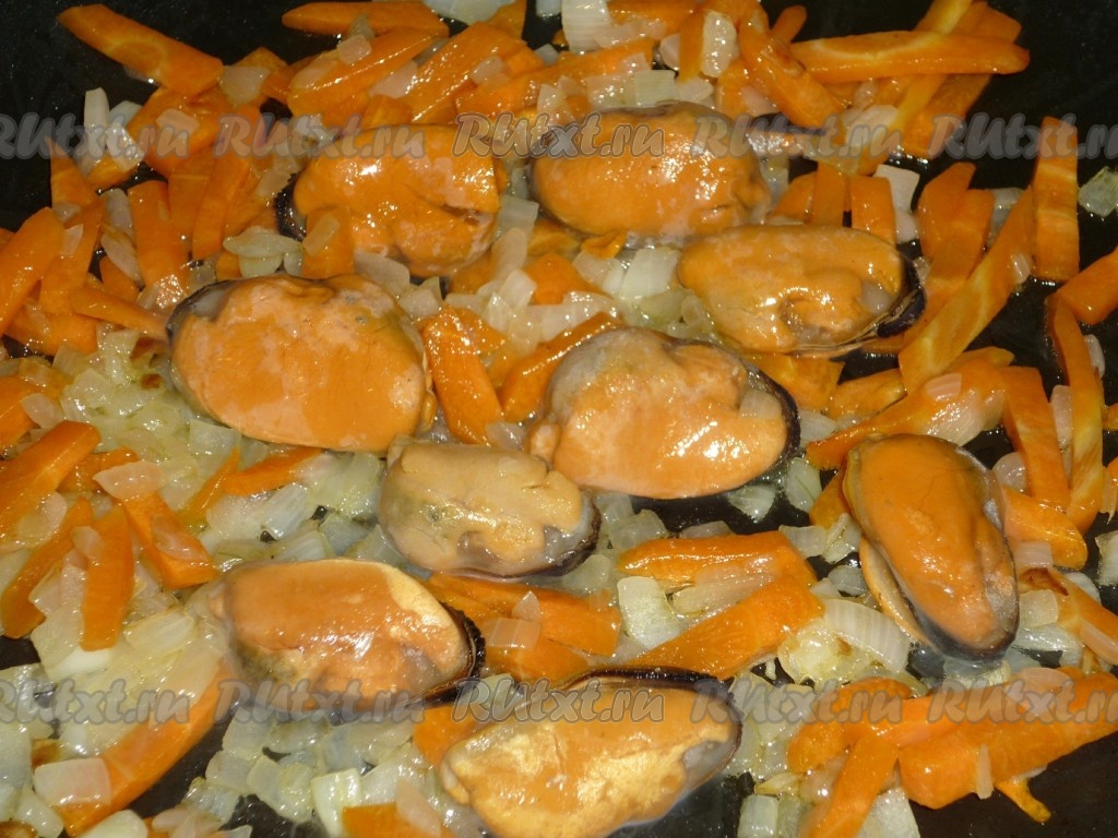 Мидии моем и добавляем к обжаренным овощам и готовим, помешивая, в течение 5 минут.
