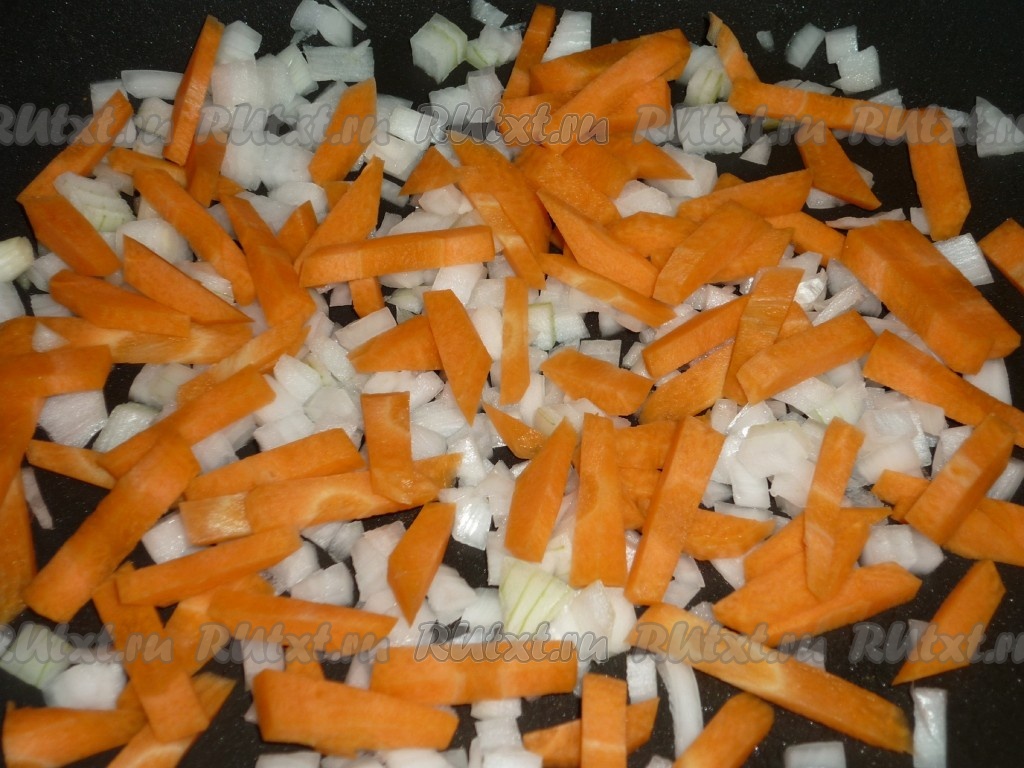 Лук режем кубиками, морковь нарезаем брусочками. Обжариваем лук и морковь на растительном масле 2-3 минуты.