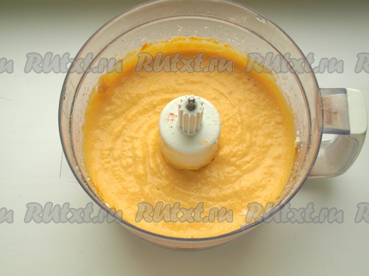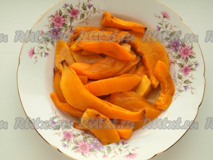 Тыкву очищаем, режем на кусочки, выкладываем в форму для выпечки (или на противень, застеленный пергаментом) и запекаем в разогретой духовке минут 30-35 (до мягкости) при температуре 180 градусов. Достаём мягкую тыкву из духовки, даём остыть.