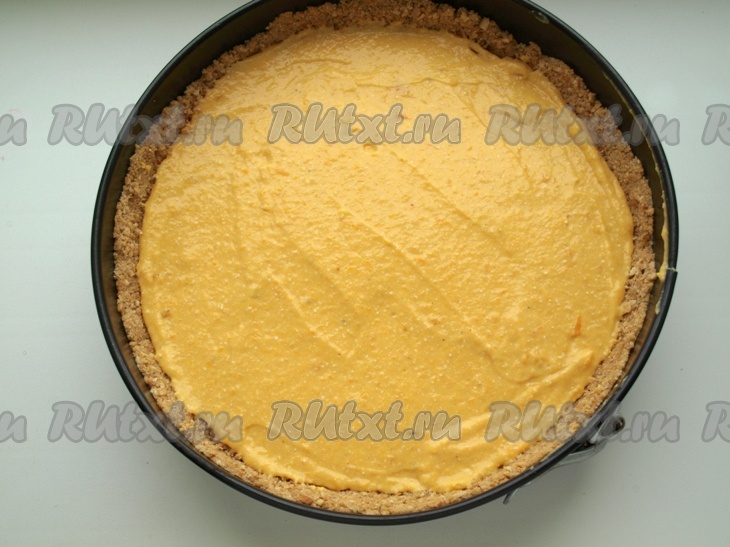 Достаём форму с основой для чизкейка из холодильника и на основу из печенья равномерно выкладываем тыквенно-творожную массу.