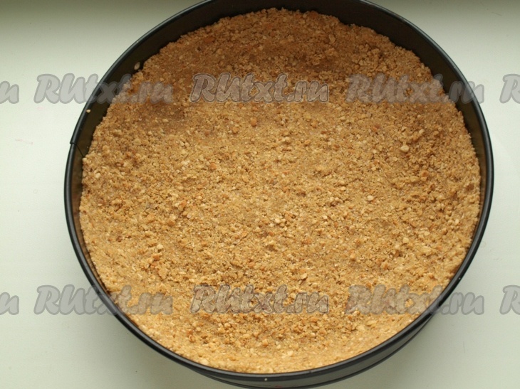 Полученную массу выкладываем в разъёмную форму. Равномерно распределив массу по дну формы и сформировав бортики, получаем основу творожно-тыквенного чизкейка. Убираем форму на 1 час в холодильник.