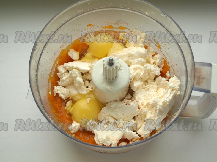 К тыквенному пюре добавляем творог, 100 грамм сахара, а также яйца, сливки, ванильный сахар, корицу, мускатный орех, соль.