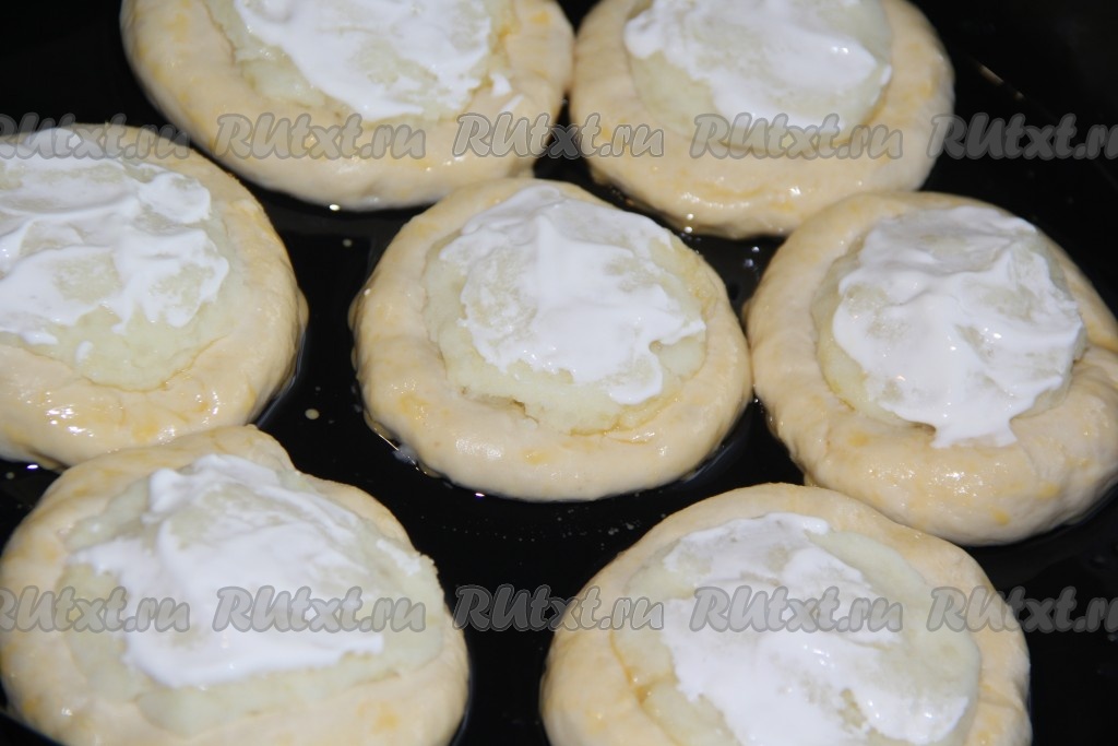 Готовые ватрушки с картошкой выложить на противень, смазанный растительным маслом. Прикрыть противень с ватрушками полотенцем или пищевой плёнкой и оставить на 30 минут для подъёма. Затем смазать тесто взбитым желтком, а поверхность пюре смазать сметаной.