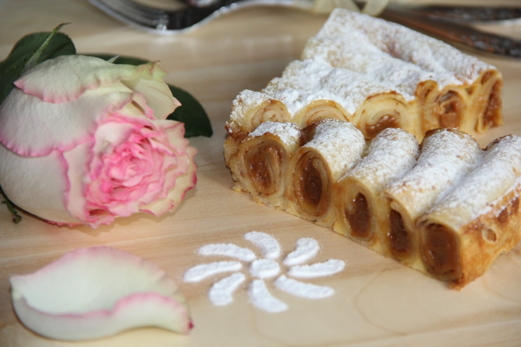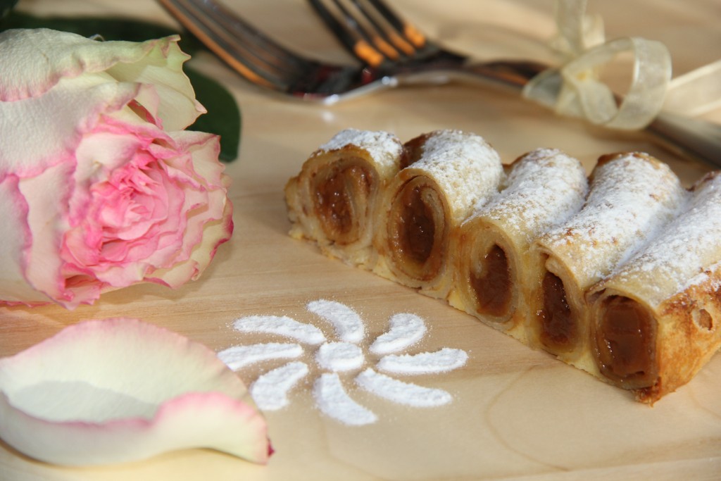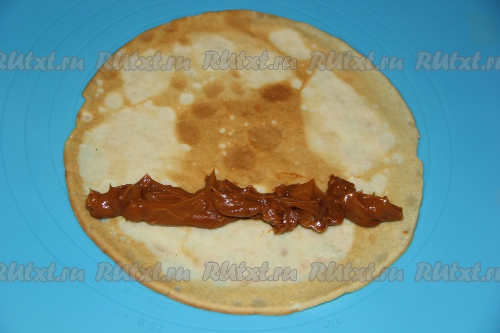 На край блинчика выложить немного варёной сгущёнки.