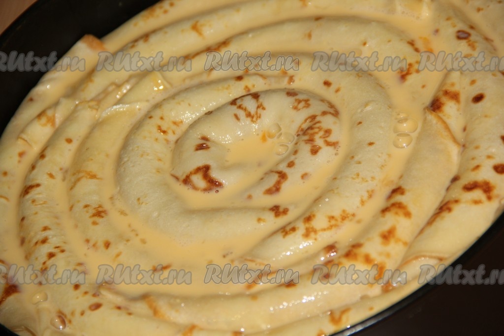 Духовку заранее разогреть. Залить блины приготовленной заливкой и поставить в духовку. Выпекать при 180 градусах примерно 30-40 минут.