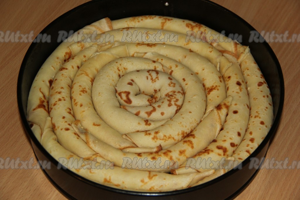 Подготовленные блинчики плотно выложить в виде улитки в круглую форму (я использовала разъёмную форму).