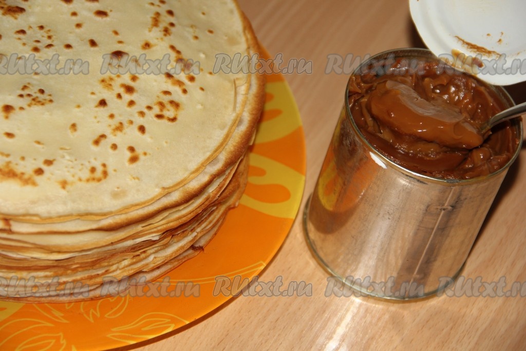 Для начала испечь блинчики по любимому рецепту. Варёную сгущёнку можно использовать покупную или сварить самостоятельно.